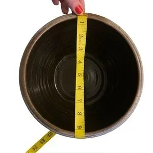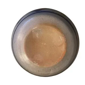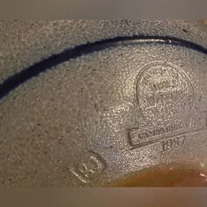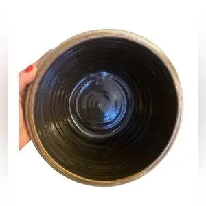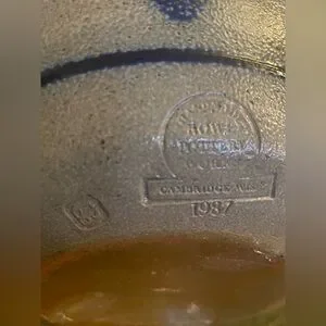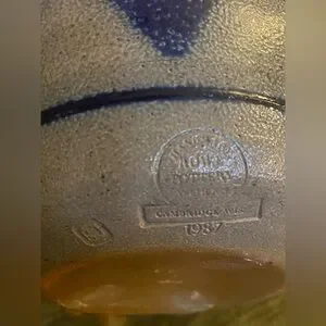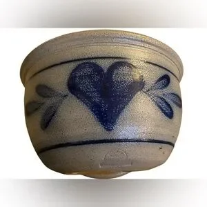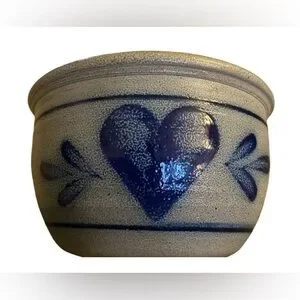 The Rowe Pottery Bowl from 1987 features a beautiful blue heart salt glaze design, hand-painted on stoneware pottery. This vintage piece is a round 9" It is a unique and folk-style art pottery item that would make a lovely addition to any collection or as a special gift for all occasions. Made in the United States Cambridge, Wisconsin, where it has been handcrafted by artisans since 1975. All of their pottery is made at their studio in Cambridge, using traditional methods.