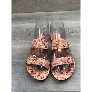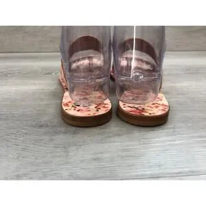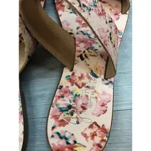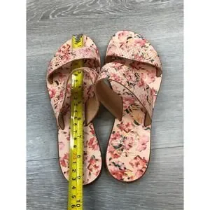 Step into summer with these charming floral print flat sandals. Delicate blossoms in shades of pink red and yellow adorn the comfortable footbed and the textured straps offer a secure and stylish fit. The elegant design makes them perfect for a sunny day out or a relaxed vacation.