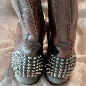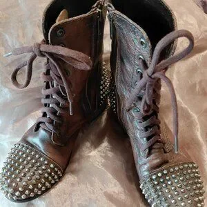 Studs at round toe and rear, mid calf, lace up. block heel. Goth, grunge, biker style.