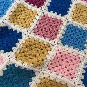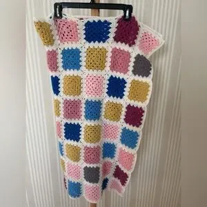 Soft crochet blanket featuring vibrant granny squares. White borders frame colorful squares in pink, blue, mustard, burgundy and gray.