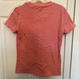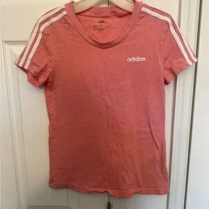 Soft coral-pink crew neck tee. Minimal adidas logo at the collar. Simple, sporty silhouette. Lightweight and easy to wear.