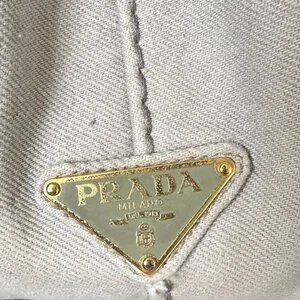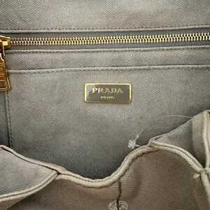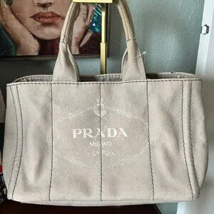 Beautiful Vintage Prada Canapa Canvas Tote. Has wear. There are stains marks on both side by the snap closure. When snap close not very noticeable. There is wear in corners. There are some stains on back and bottom. Inside is clean with some marks. Some wear discoloration on handles. Some stains on pipping on top. Please look at all pictures.