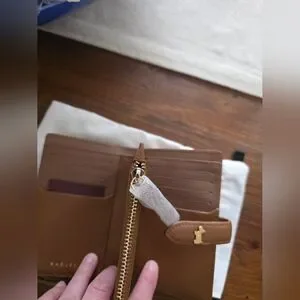 brown leather compact wallet with signature Scottie dog hardware. Soft pebbled leather with secure snap tab closure. Multiple card slots and a handy coin compartment for everyday organization.