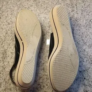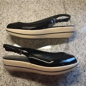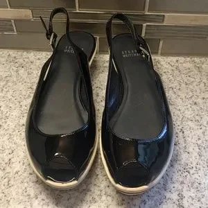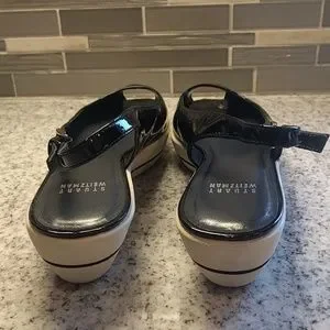 Sling back and peep toe Stuart Weitzman shoes are a women's size 7.5. Black patent upper. Foamy/cushioned sole. Comfortable and cute! Very lightly used, these are in excellent used condition. Please note a small section on the inside of one of the platforms is missing the black trim.