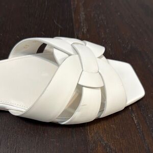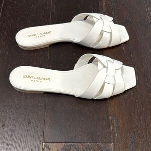 Elevate your style with these elegant white slide sandals from Saint Laurent. Perfect for any occasion, these sandals offer both comfort and sophistication. These are authentic and come with dust bags and box. These have minimal wear and are in good condition.