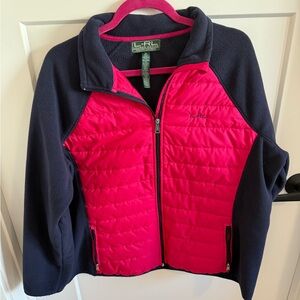 Stylish and functional L-RL Lauren Active by Ralph Lauren hybrid jacket featuring a quilted puffer front with soft fleece sleeves and back. This sporty layer provides warmth without bulk and is perfect for everyday wear, travel, or outdoor activities.
