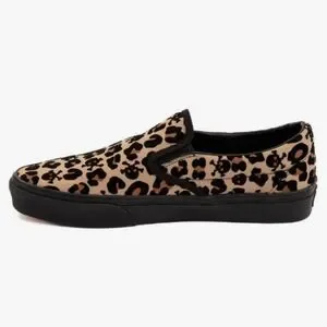 Stylish Vans slip-ons with a striking skull and leopard pattern. Features a durable black sole.