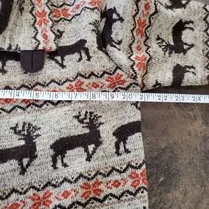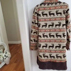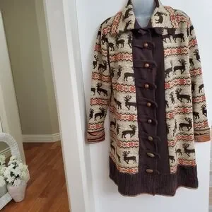 Unique coat with deer pattern. Button-up front. Cozy and stylish.