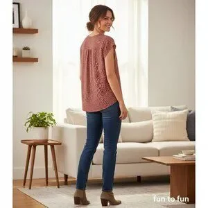 mauve blouse, v-neck blouse, Fun2Fun top, cap sleeve top, white print shirt, relaxed fit blouse, women's casual top, lightweight blouse, polyester shirt, white speckle print, mauve casual wear, chic women's blouse, machine washable top
