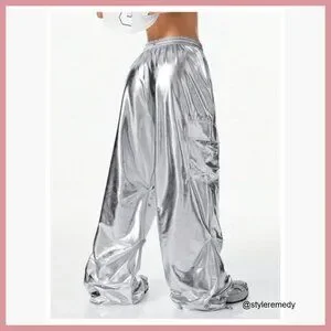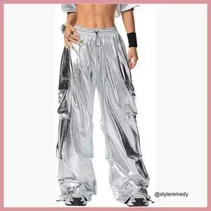 Metallic Cargo Pants Wide Leg Baggy Joggers Polyester Blend