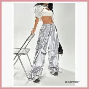 Shiny, wide-leg joggers designed for standout comfort at festivals, clubs, or casual outings. Feature a drawstring waist, cuffs, and utility pockets for a trendy, functional look.