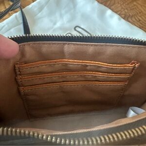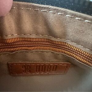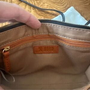 HOBO crossbody bag. It is a sleek, polished leather accessory designed for maximum utility. Very elegant.