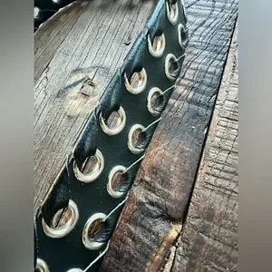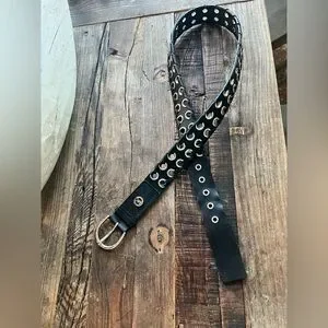 Edgy black leather belt with repeating grommet details. Silver-tone buckle and eyelets add shine.