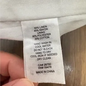 White fabric with vertical green leaf embroidery. Elastic waistband with tassel accent. Breezy, stylish summer piece. Easy to pair with casual or dressy tops.