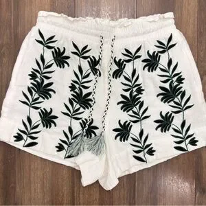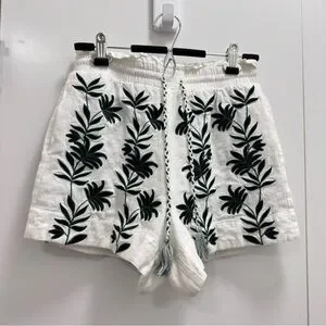 House of Harlow 1960 White Shorts with Green Leaf Embroidery