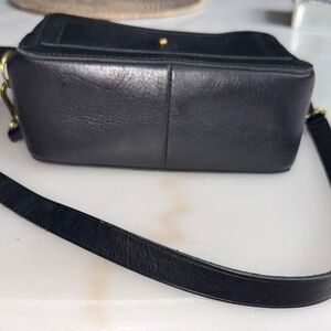 EUC. Sleek and stylish black leather crossbody bag with gold accents. Adjustable straps. Perfect for any occasion. 7.5” x 3” inches.