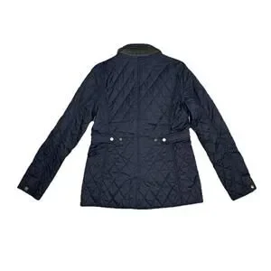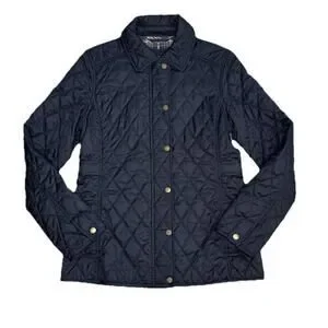 This LL Bean Women's XS Quilted Riding Jacket in Black is a stylish and practical outerwear option for the colder seasons. Made with polyester outer shell material and lined with nylon, it provides insulation and protection from the elements. The jacket features a full zip closure, snap buttons, and a plaid-lined collar for added style. With a solid black color and a classic quilted design, it can be worn for various occasions such as travel, casual outings, or workwear. The jacket also has a logo accent and a regular fit for comfortable wear. Gently worn. No signs of wear. Smoke-free, pet-free home.