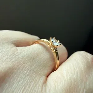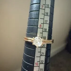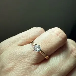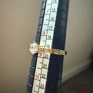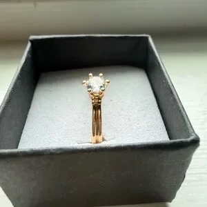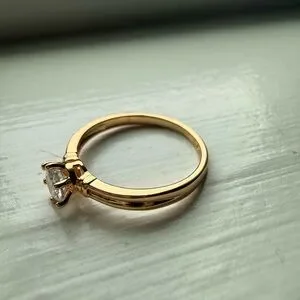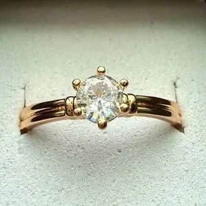Elegant gold solitaire ring featuring a brilliant round-cut clear stone. Classic design with six-prong setting for secure sparkle. Perfect for everyday wear or special occasions. Gold-toned finish with clear center stone.