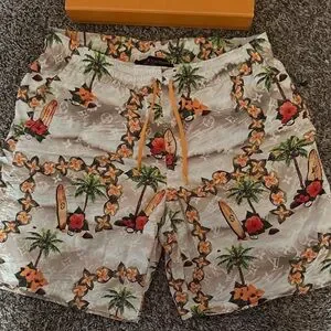 Louis Vuitton men's swim trunks in beige with a vibrant tropical print. Features adjustable drawstring waist for a secure fit. Lightweight fabric with palm tree and surfboard motifs. Mens medium like new only worn 1 time