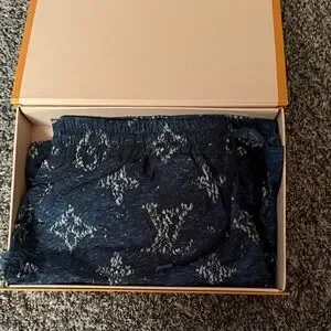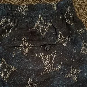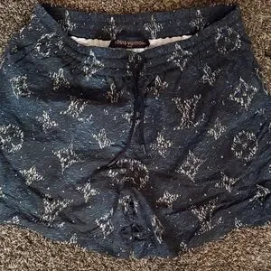Designer swim trunks with allover monogram pattern. Drawstring waist for adjustable fit. Lightweight textured fabric. Classic luxury branding detail. Men’s medium like new worn one time