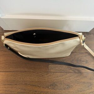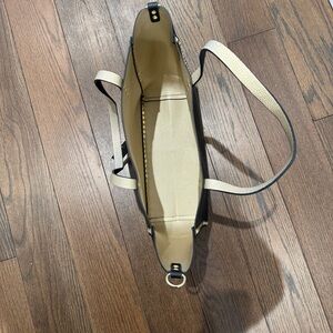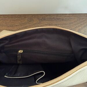 Second bag in gold tone fits perfectly inside the tote or separately. This bag has zippered section and open pockets. Removable shoulder strap. Measures 10”H and 15”W.