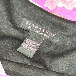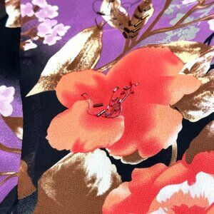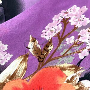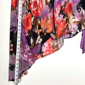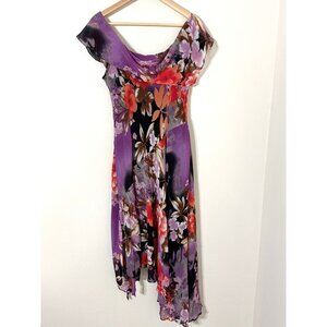Vintage Y2K Signature by Robbie Bee purple chiffon floral dress with beaded details on the front, asymmetrical handkerchief hem, flutter sleeves, cowl neckline, and fully lined (lining mirrors the shape of the hemline).