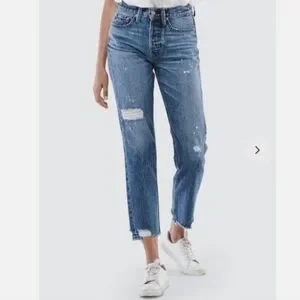 Cropped high-rise women's jeans in a medium blue wash with subtle distressing and raw hem. Designed for a relaxed straight-leg fit that pairs easily with sneakers or flats. Comfortable stretch denim for everyday wear. Blue color adds a versatile casual look.
