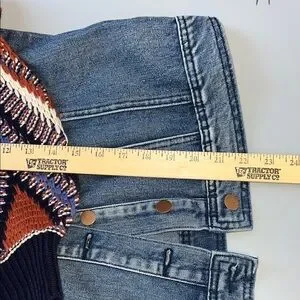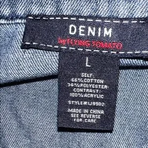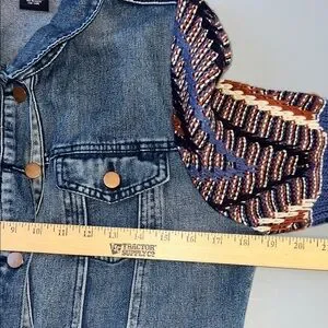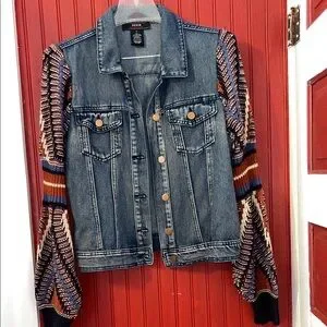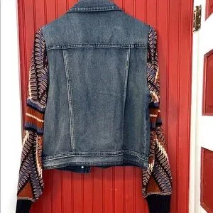 Flying Tomato Boho Women's Denim Jacket with Multicolor Knit Sweater Sleeves L