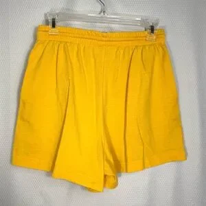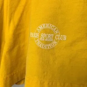 Vintage Paris Sports Club Bright yellow casual shorts with elastic drawstring waist. Soft cotton look fabric. Small white Paris Sport Club logo on front. Simple everyday style