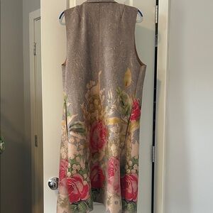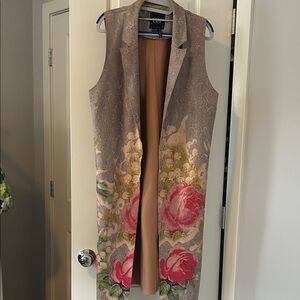 Sleeveless Taupe Floral Long Vest with Pink Rose Detail