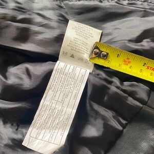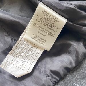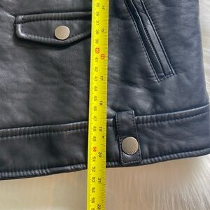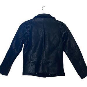 Classic biker silhouette in black faux leather. Asymmetric zip front with multiple zip pockets. Snap and quilted accents for a rugged look. Soft lining for comfortable wear.