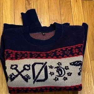 Navy crewneck sweater with a red and cream Fair Isle-inspired band across the chest and sleeves. Soft knit fabric for comfortable daily wear. Ribbed neckline, cuffs, and hem provide a neat fit. Versatile seasonal piece that pairs easily with jeans or chinos.