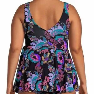 This flattering one piece features a feminine wrap skirt overlay with side tie detail, creating a stylish swim dress silhouette while still providing the comfort and support of a one piece swimsuit. The colorful paisley floral print reflects Johnny Was signature bohemian aesthetic.