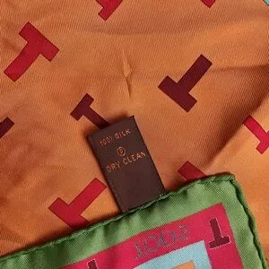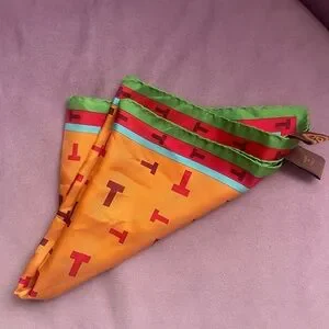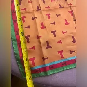 Elegant silk scarf with T pattern. Features orange, green, and red hues.