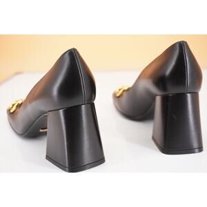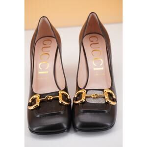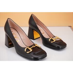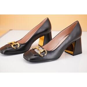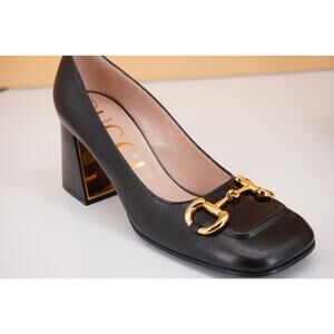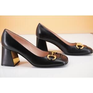 Gucci Black Leather Horsebit Block Heel Pumps with Gold Hardware