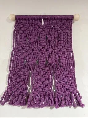 Beautiful purple macrame wall hanging with intricate knot design.