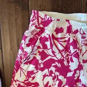 Bright floral print in vibrant pink and cream. Wide-leg silhouette for relaxed movement. Elastic waistband for easy wear. Lightweight, breathable fabric ideal for warm days.