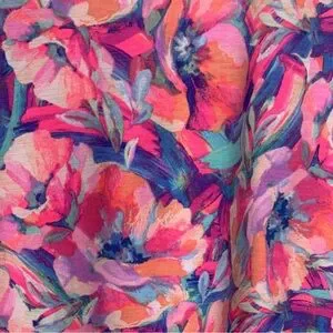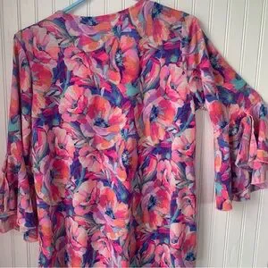 Dear Scarlett (M) Vibrant Floral Blouse in Pink and Blue with ruffled sleeves. Eye-catching design for any occasion. Looks like a Lily P