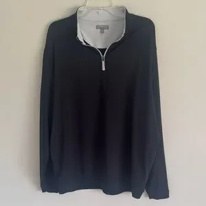 Lightweight quarter-zip pullover from Peter Millar. Smooth black fabric for a sleek look. Contrasting white inner collar and zipper trim. Easy to layer over shirts. Casual yet refined style.