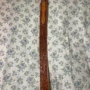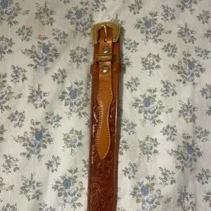 Classic brown tooled leather belt with a polished gold-tone buckle. Elegant embossed detail adds western-inspired style. Designed for everyday wear to elevate casual and dress outfits. Features secure gold buckle closure and rich brown leather finish.
