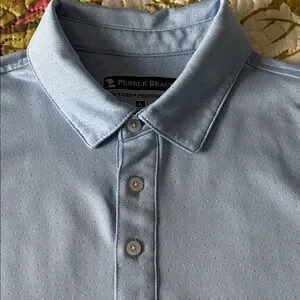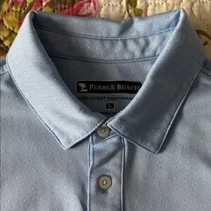 Light blue Pebble Beach polo. Breathable knit with three-button placket. Soft structured collar for comfort. Great for golf or casual wear.