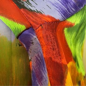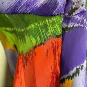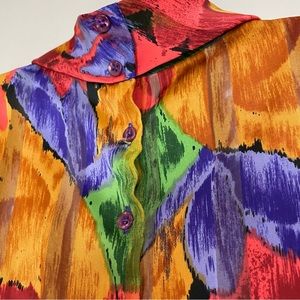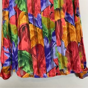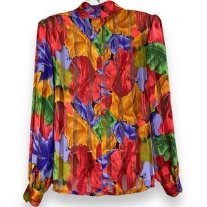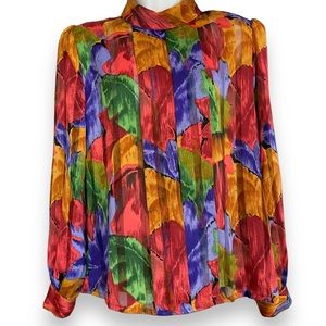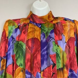 Vintage Floral Blouse Sheer Stripe Vibrant Colors Rolled Collar Eclectic Pleats