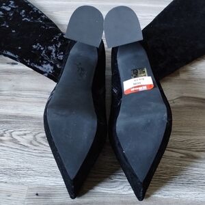 A crushed velvet upper underscores the luxe appeal of a pointy-toe boot lofted by a chunky platform and flare heel. 6" heel; 2 1/4" platform 14 1/2" shaft; 13" calf circumference Textile upper/leather and synthetic lining/synthetic sole