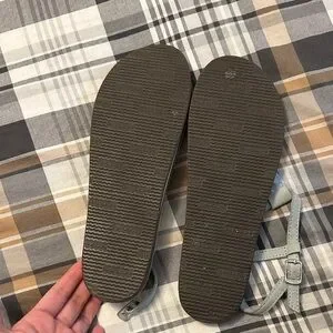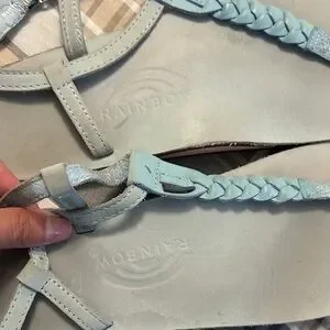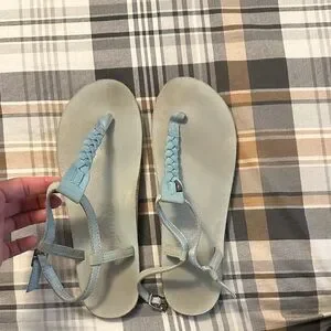 Stylish light blue sandals. Braided strap design. Comfortable and chic.