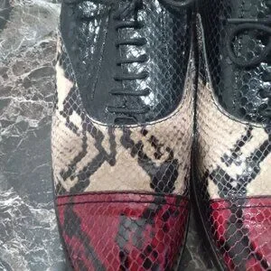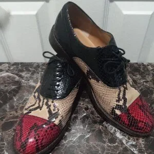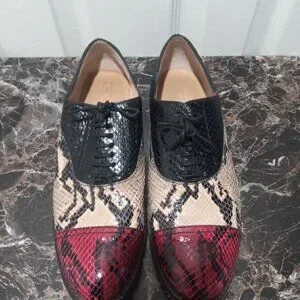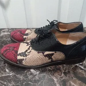 Stunning craftsmanship in these Marc Jacobs oxfords from the 2010's. A mix of black, yellow and red python skin with black top stitching and simple black laces. Very good vintage condition with small signs of wear. Marked size 39 which is equivalent to an 8.5 in U,S, sizes but these run small and fit more like an 8 Made in Italy. Sold without original sleeper bags or box.