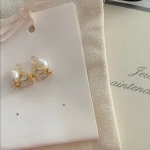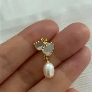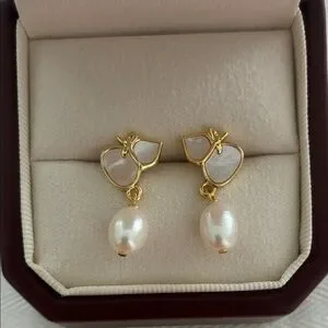 Elegant handmade earrings featuring mother of pearl and freshwater pearls with gold enamel accents, offering a touch of classic beauty.