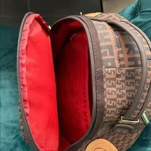 Brown Sprayground shark backpack in great condition. Tan shark mouth design with all over logo print. Clean, small stain in interior , zippers and straps in good shape.