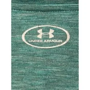 Under Armour women's athletic top in a teal heathered pattern. This long sleeve quarter zip features a mock neck and the iconic Under Armour logo on the chest and back. Perfect for workouts, running errands, or casual wear.