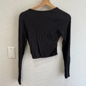 Elegant black blouse. Long sleeves. Deep V-neck design. Perfect for casual or formal wear.