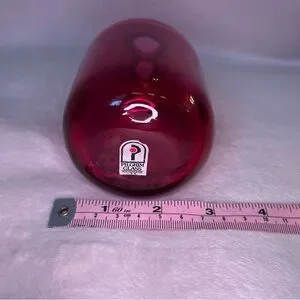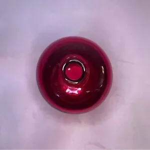 Vintage Pilgrim hand blown cranberry glass with a smooth rounded form. Simple neck for a single stem. Glossy finish lends refined shine. Versatile accent for shelves or tabletops.